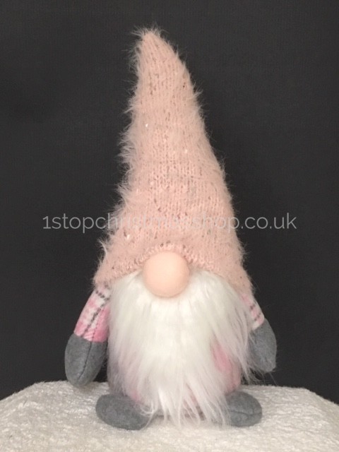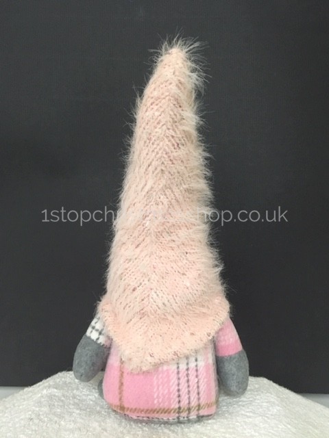 Gonkert is an adorable plush little character with a soft white faux fur beard … hiding away under his stylishly knitted soft touch mohair-style pink hat that’s glistening with small pink sequins. He has an impressive soft, felt like pink, grey & white plaid patterned body & arms, with cute little grey feet & matching gloves. His weighted base allows him to sit stable on a windowsill or perch on the mantel-piece & just adores playing hide ‘n’ seek under the Festive tree!