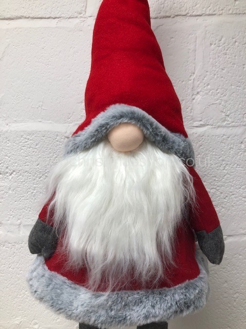 This adorable bobbin ‘n’ wobbly Nordic style Santa Gonk with his bushy white beard is sure to be the centre of attention … Hiding away under his amazing, soft to the touch red velour style hat that’s adorned by a captivating ultra soft smokey grey faux fur trim. His hat is wired so that it can be bent into your preferred position. He is wearing a traditional Festive red felt like coat trimmed with ultra soft smokey grey faux fur. His dark grey felt-like gloves & matching leggings co-ordinate perfectly with his Festive red hat & coat. This lively character just loves to jiggle and wobble around; The spring and attachments are hidden under his amazing coat and to assist with stability he has impressive heavy weight stone style boots attached to his legs & of course for that extra special finishing touch … trimmed with ultra soft smokey grey faux fur!