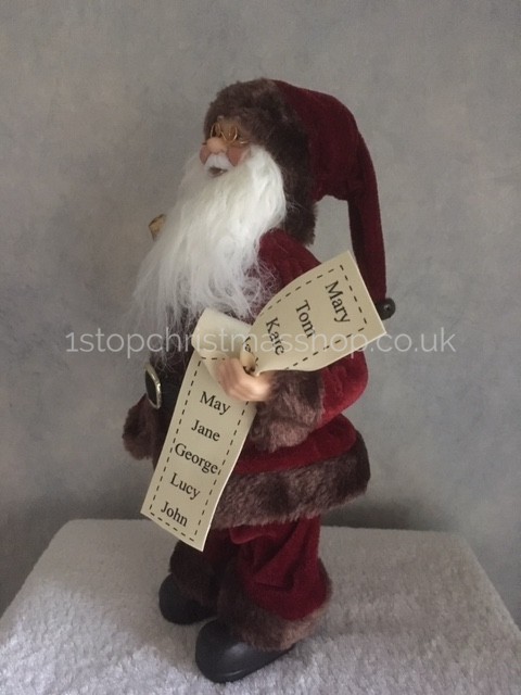 Ho, ho, ho … Here’s Santa with his impressive bushy white beard wearing an amazing soft, velvety feel burgundy suit. His hat, jacket & trousers all have a gorgeous chocolate brown faux fur trim. Clutching two beautifully decorated parcels & his delivery list of names, he’s now ready to start trekking through the snow. Good job he’s wearing his traditional black boots & black belt supported by a gleaming gold buckle. To ensure the reindeers know he’s on his way … a jingling bell is attached to the end of his hat.